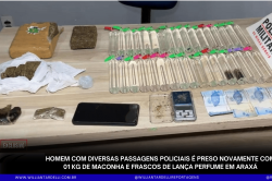 Homem com diversas passagens policiais é preso novamente com 01 kg de maconha e frascos de lança perfume em Araxá.